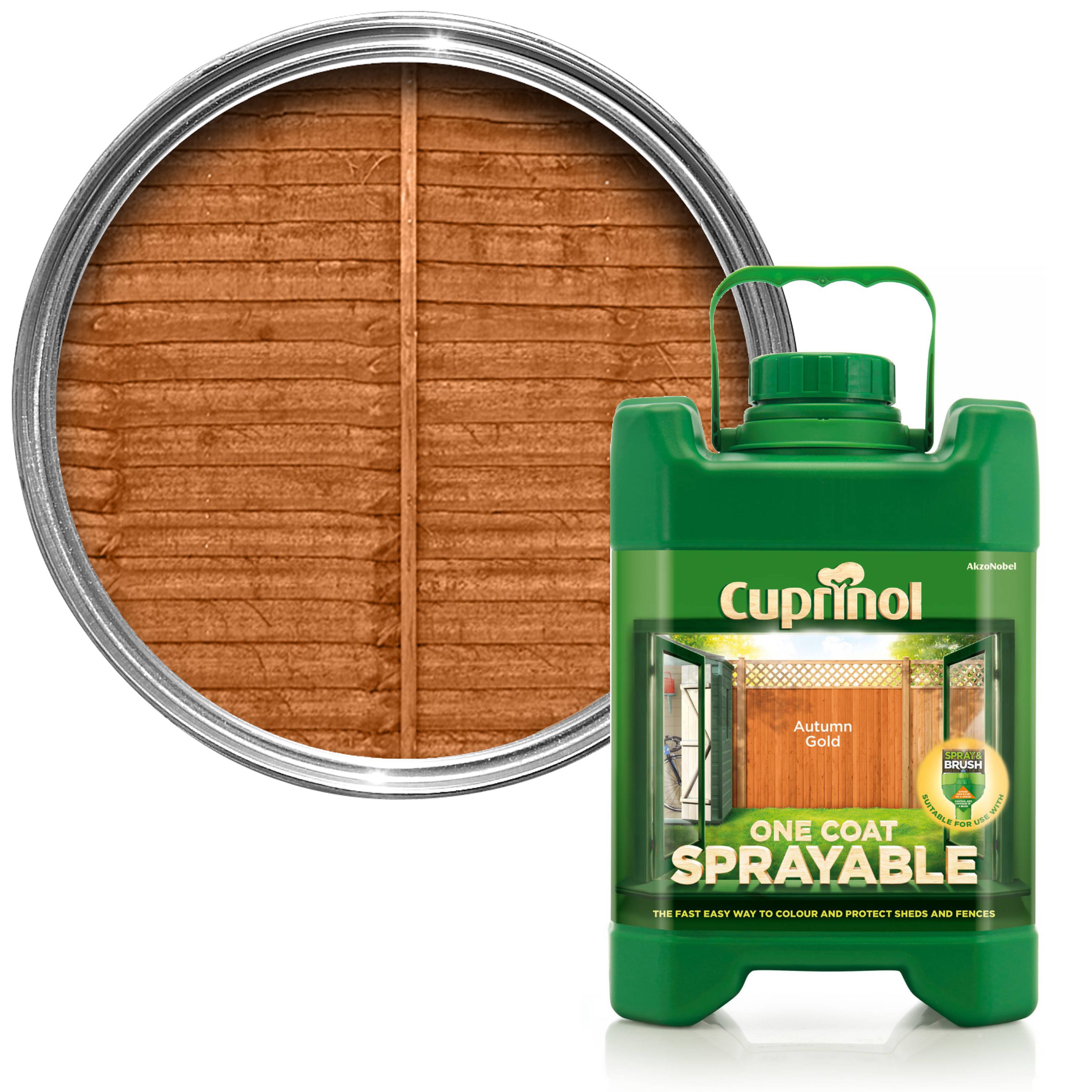 Cuprinol one coat sprayable shed fence paint harvest brown 5l.